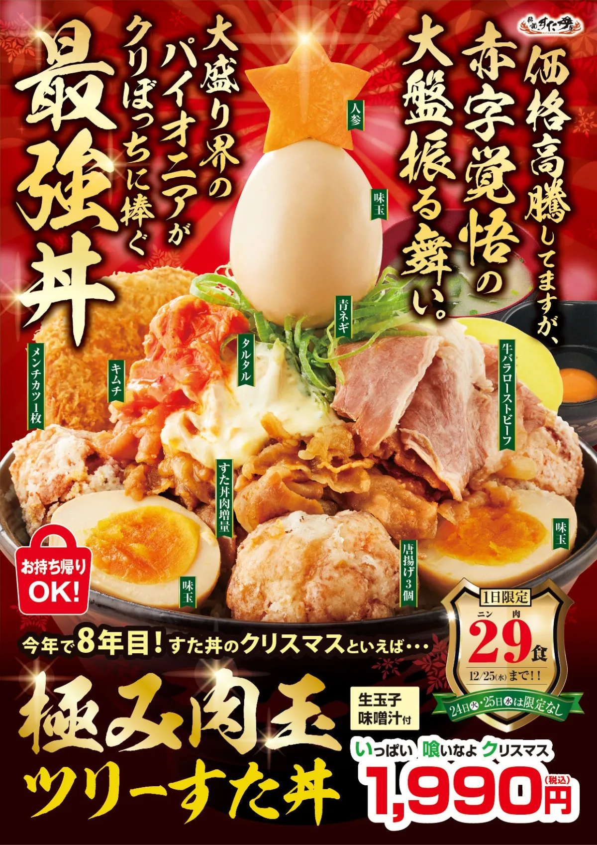 今年のクリスマスは、特別な『極み肉玉ツリーすた丼』でお祝いしてはいかがでしょうか。ボリュームたっぷりで見た目にも楽しいこのメニューは、一年の締めくくりを華やかに演出してくれます。心もお腹も満たされるこの機会をお見逃しなく!