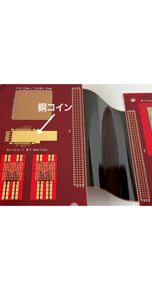 宇宙空間では、地上とは異なり対流が無いため、発熱する電子部品の効果的な放熱が難しいという課題があります。OTCでは、高い熱伝導率を持つ銅を用いることで、この問題を解決しました。特許技術である「銅コイン埋め込みPCB技術」を用いて、基板のスルーホールに銅コインを挿入し、高発熱部品と接合することで、効率的な放熱を実現しています。これにより、今回開発されたフレックスリジット基板は、真空環境でも高い放熱性を発揮します。