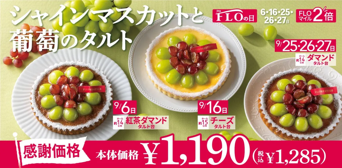 今月のFLOの日に合わせて、特別販売されるタルトは、秋の味覚を最大限に引き出した「シャインマスカットと葡萄のタルト」です。直径約14~15cmのこのホールタルトは、滑らかな甘さの赤葡萄と、果汁たっぷりのシャインマスカットが見事に盛り付けられています。価格は税抜1,285円。合計3種類のタルト台で楽しめるのが特徴で、6日はアールグレイの香り漂う紅茶ダマンド台、16日はクリーミーなチーズ台、そして25~27日はサクサクのダマンド台がそれぞれ特性を活かし、贅沢な秋の味を演出します。