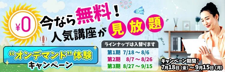 NHKカルチャーでは、昨年に引き続き「オンデマンド」体験キャンペーンを実施しています。このキャンペーンでは、対象講座に無料で申し込むと、その日から7日間、好きな時間に何度でも楽しむことができる特別な機会です。期間は2025年7月18日(金)から9月15日(月)までの約2ヶ月間です。この夏、お家での時間をもっと有意義に、そして楽しんでみませんか?