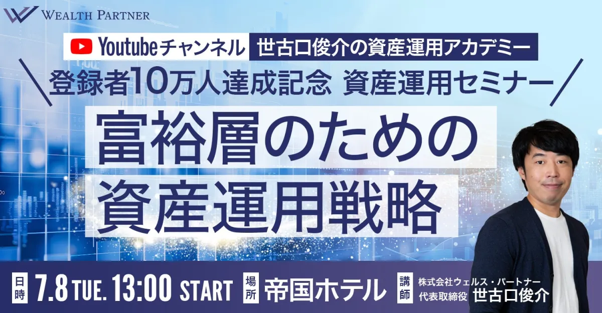 2025年7月8日、著名なプライベートバンカー、世古口俊介氏が代表を務める株式会社ウェルス・パートナーが、資産1億円以上の富裕層を対象にした特別なセミナーを帝国ホテルで行います。このセミナーは、世古口氏のYouTubeチャンネル「世古口俊介の資産運用アカデミー」の登録者が10万人を突破したことを記念して企画されました。