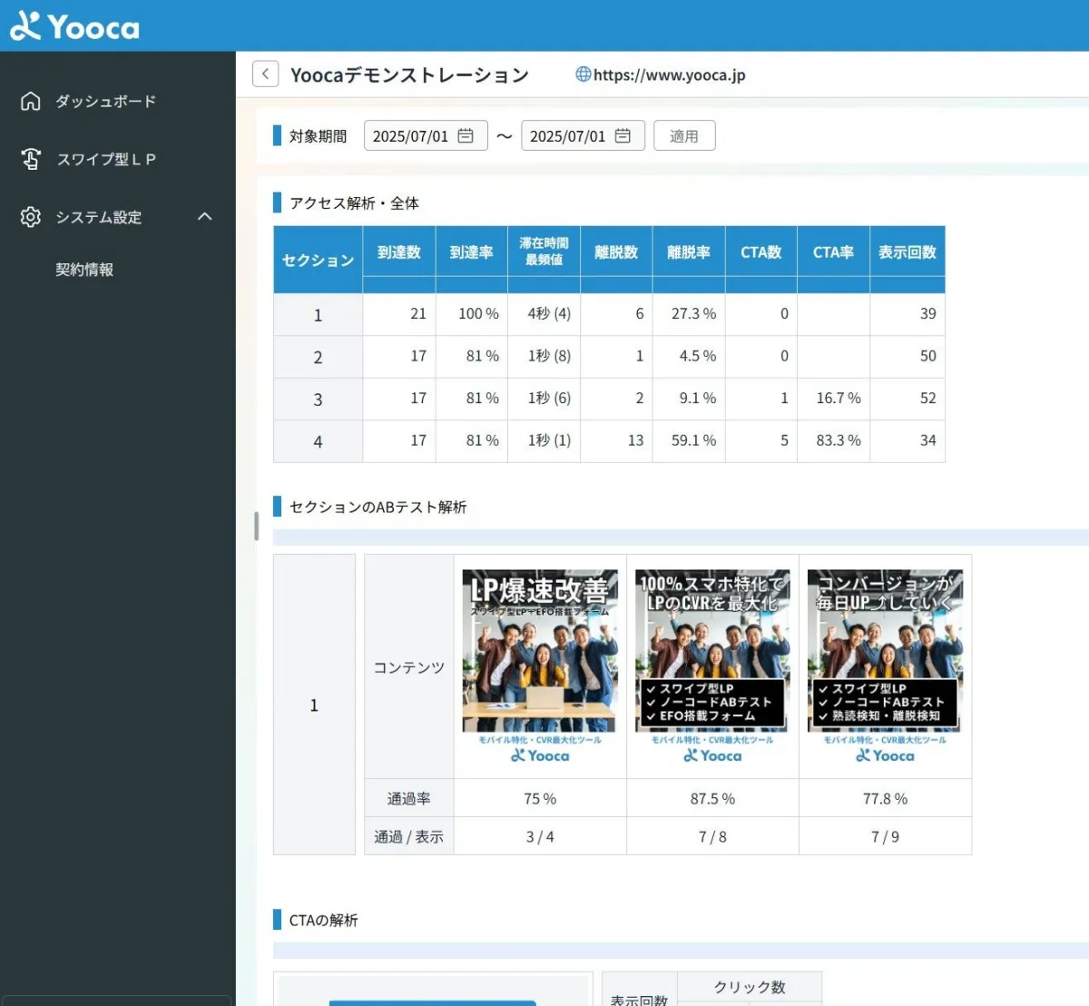 Yoocaは、スワイプ操作に特化したLP制作を可能にするツールです。簡単な操作でスワイプ型のLPを生成できるため、これまでの煩雑なHTMLコーディングを必要とせず、短時間かつ低コストで制作を上げることができます。また、ABテストやアクセス解析などの機能もノーコードで利用できるため、LPの改善を迅速に行うことが可能です。