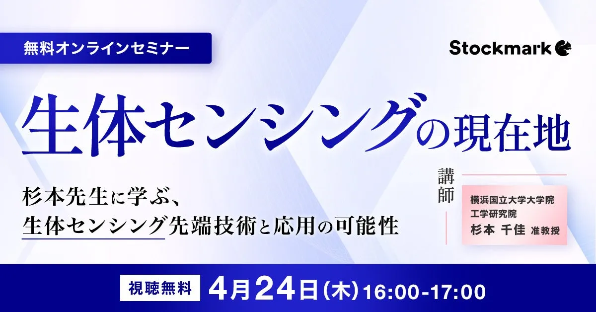 ストックマーク株式会社は、4月24日(木)にオンラインセミナー『生体センシングの現在地‐杉本先生に学ぶ、生体センシング先端技術と応用の可能性』を開催します。このセミナーでは、生体センシング技術に関する最新の知見を横浜国立大学の杉本千佳准教授が語ります。参加は無料で、事前登録が必要です。詳細と登録は