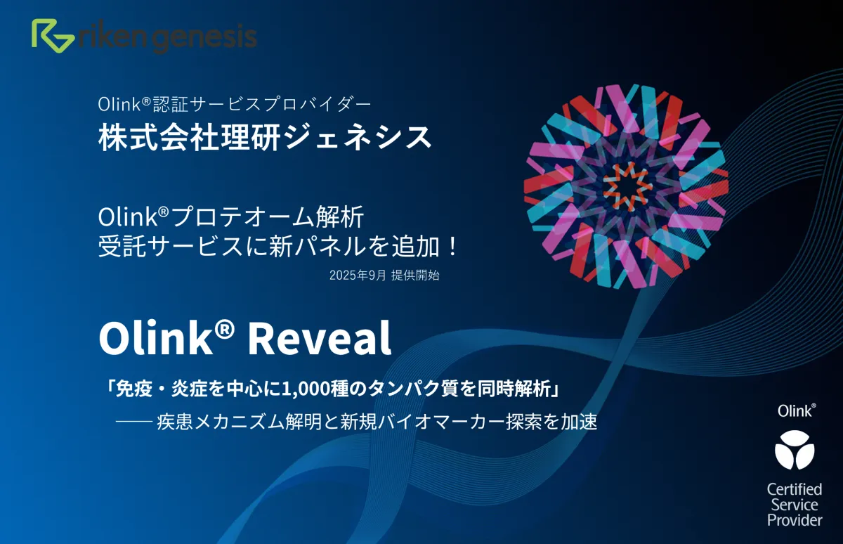 株式会社理研ジェネシスでは、今後も最新の技術を提案し、学術界や医療分野におけるニーズに応じたサービスの提供を続けていきます。新しい「Olink® Reveal」サービスを通じて、多くの研究者の方々に貢献できることを心より願っています。