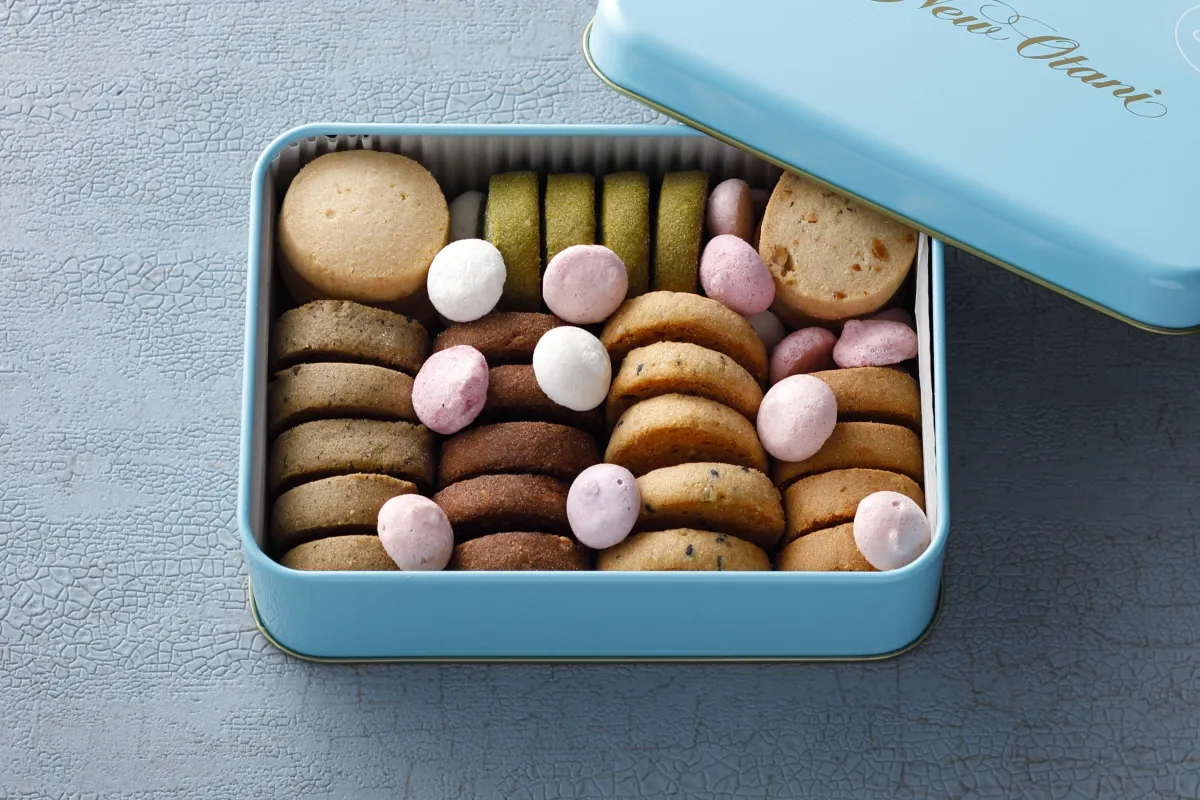 鮮やかな水色のパッケージで販売されている「オータニブルー」シリーズは、お祝いや贈り物にも最適です。こちらには、オリジナルクッキー、濃厚なチョコレート、パステルカラーのメレンゲが詰め込まれており、見た目にも美しいです。