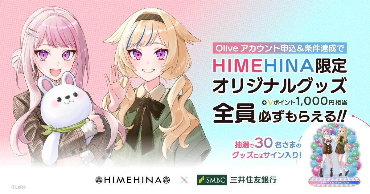 バーチャルアーティストのHIMEHINAが、三井住友銀行の個人向け金融サービス「Olive」と手を組み、特別なプレゼントキャンペーンを実施しています。このキャンペーンでは新たにOliveアカウントを開設または切り替えた全ての方に、「HIMEHINA限定オリジナルグッズ」、「Vポイント(1,000円相当)」、「描き下ろしイラストを使ったスマホやPCの壁紙」がもらえるという魅力的な内容です。さらに、抽選で30名様には複製サイン入りの限定アイテムもプレゼントされます。