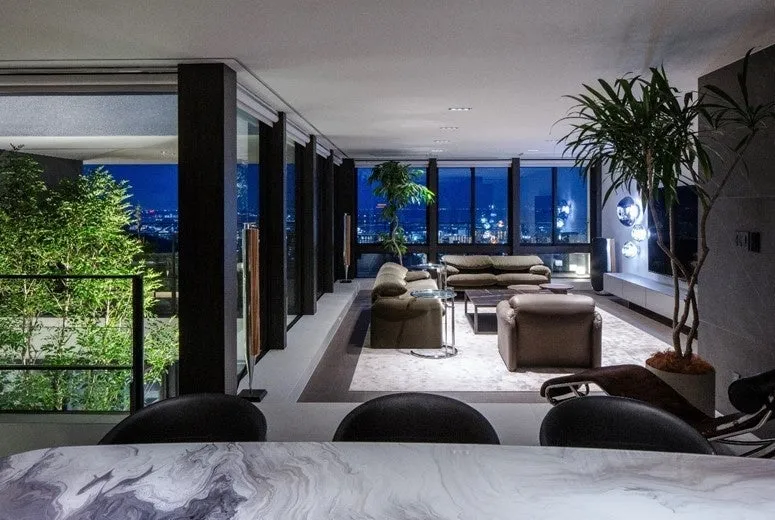 中央には明るい光が差し込むライトコートが設けられており、室内全体に自然光が行き渡っています。また、生活に必要な明るさを確保しつつ、壮観な景色を楽しむための大開口窓に光源の反射を遮る計画が施されており、劇的な陰影を作り出しています。夕暮れ時には、美しい夜景が広がり、日常と非日常が交差する特別な空間が創造されています。