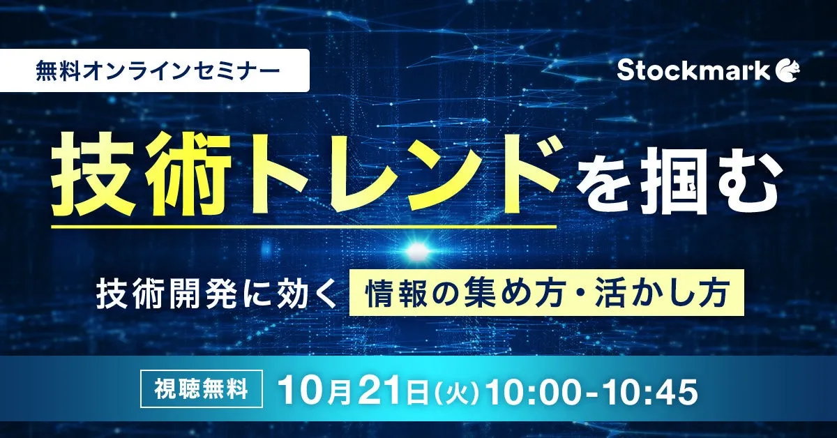 ストックマーク株式会社が主催するオンラインセミナー「技術トレンドを掴む技術開発に効く」が、2025年10月21日(火)に開催されます。このセミナーでは、製造業向けのAIエージェント「Aconnect」を活用して、技術情報をどのように業務に落とし込むかを深く考察します。