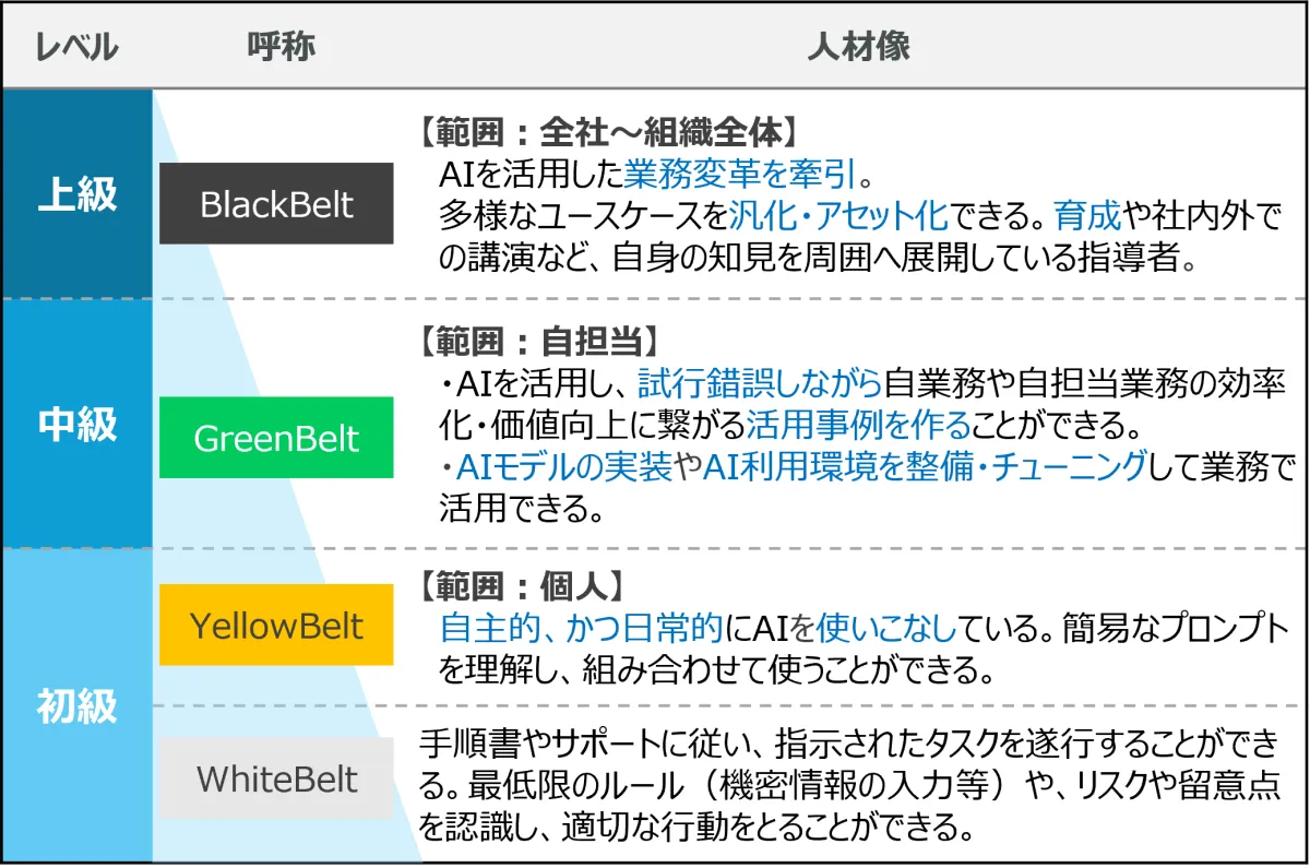 - - GreenBelt:AIを実際に使用し、業務において成果を出せるレベルへの育成。