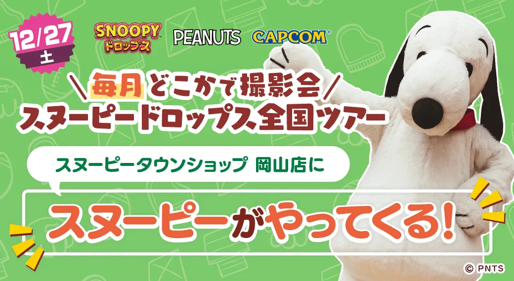 カプコンが提供する人気パズルゲーム『スヌーピードロップス』が、毎月恒例のグリーティングイベントを開催します。12月は、その舞台を岡山に移し、12月27日(土)にスヌーピーとの特別な2ショット撮影会を実施。この貴重なチャンスをお見逃しなく!