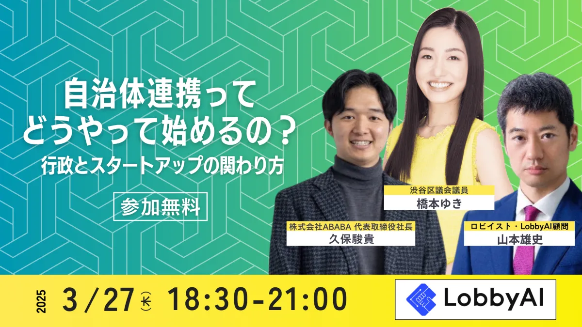 2025年3月27日、LobbyAI株式会社が渋谷の「100BANCH」で初の主催イベントを開催しました。このイベントは、行政とスタートアップの関わり方に焦点を当て、政策立案や渉外に精通した専門家やスタートアップの経営者、地方議会議員が一堂に会する機会となりました。