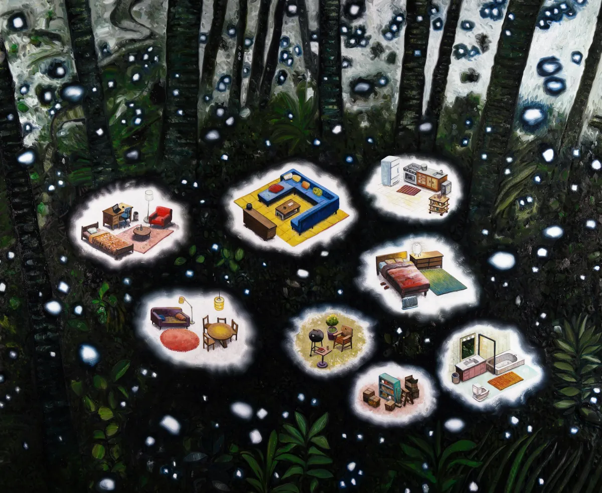 大作『Paddy Field』では、田んぼの幾何学的な構造を通じて、自然と人々が共存する力強いメッセージを発信します。この作品は、幅が2メートルを超え、目を見張るようなビジュアルですね。また、他の作品『Hell's Kitchen 2』や『Light Shop 4』などでも、日常のありふれた景観を独自の視点から切り取っています。これらの作品は、ユーモアと不安が共存する不思議な空間を創造し、観る者に新たな気づきを与えます。
