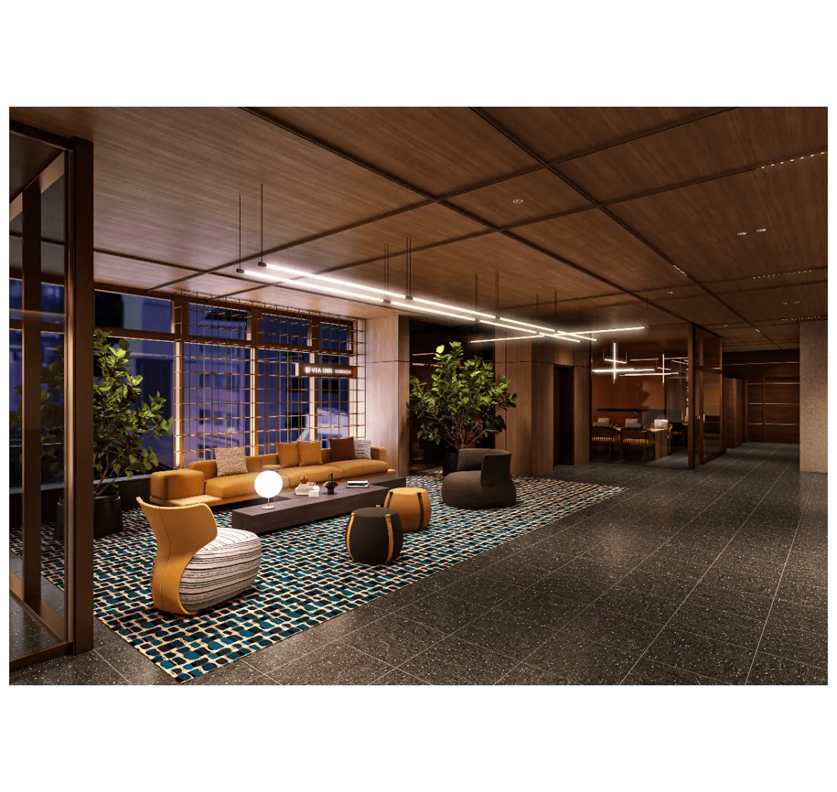 大井町は近年、駅直結の複合施設が誕生し、ますますアクセスが便利になっています。今回のリニューアルでは、戦前の大井町の発展を支えた毛織物工場からインスピレーションを受け、デザインコンセプトに反映させています。織物を象徴する格子柄が各所に散りばめられており、地域文化を感じることができる空間になっています。