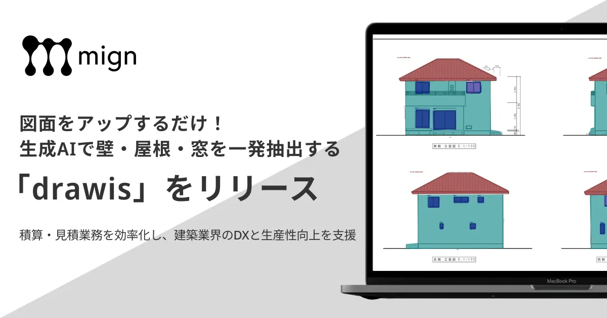 建築業界に革命をもたらす新たなAIサービス、名付けて「drawis(ドロウィス)」が株式会社mignから発表されました。この革新的なシステムは、建築図面をアップロードするだけで、AIが瞬時に壁や屋根、窓、ドアなどの各部位を認識し、自動で面積を計算してくれるというものです。従来の積算業務にかかる手間を大幅に減少させ、業務の効率化を実現します。