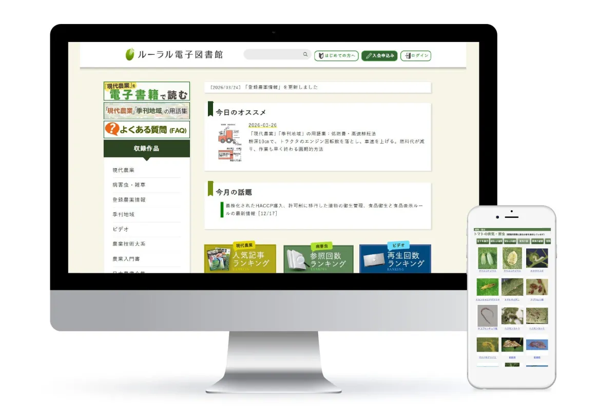 「ルーラル電子図書館」は1996年4月にサービスを開始し、以来、農業や地域づくりに関する豊富なデータベースとして多くの方に親しまれています。病害虫の診断、農薬情報、栽培技術、販売ノウハウなど、幅広い情報を網羅しており、現在では累計で20万人以上のユーザーが登録しています。
