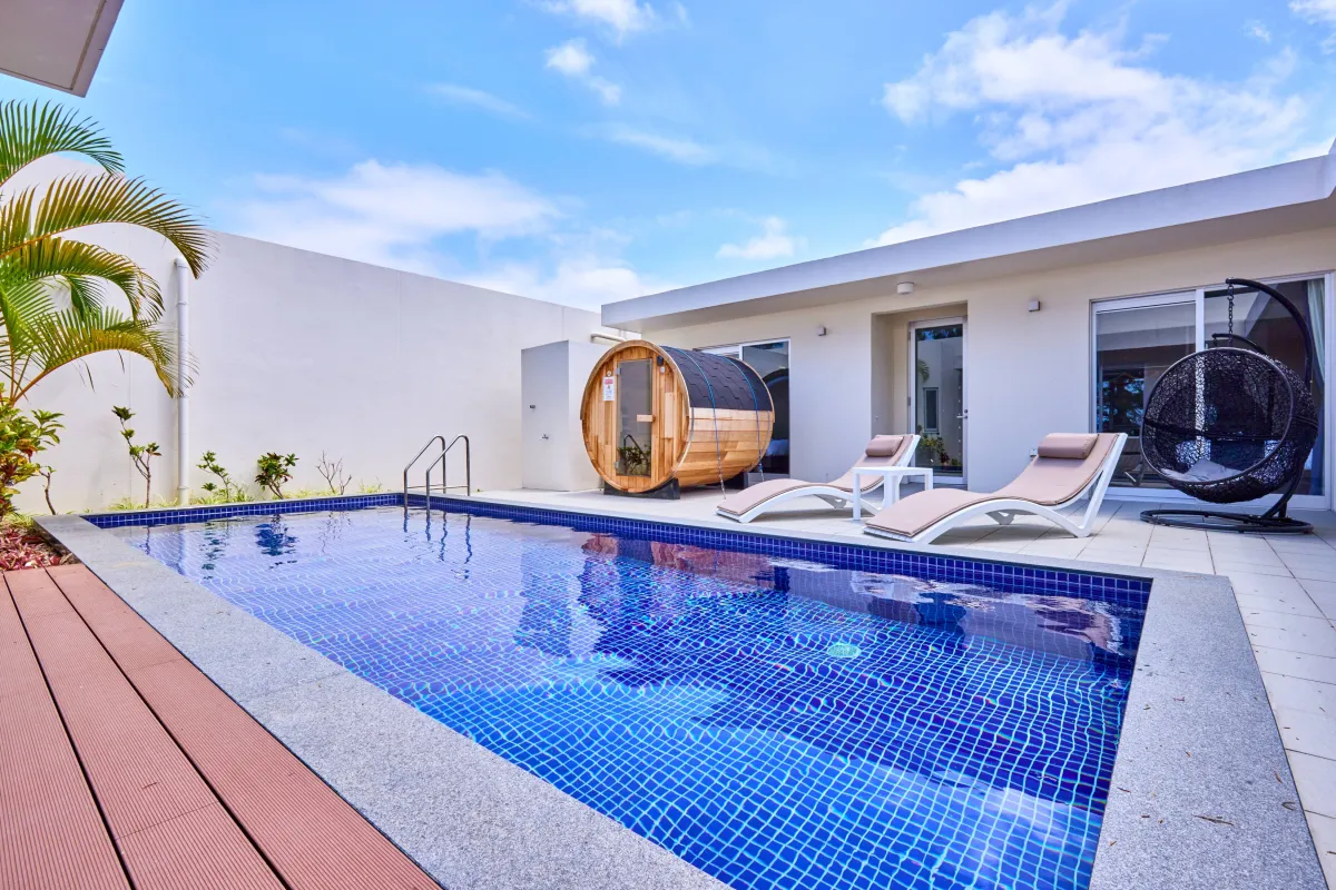 全棟に設置されたバレルサウナにより、サウナ&プールを利用したデトックス効果を最大限に引き出せるようになりました。滞在中は他のゲストを気にせずにプライベートな空間で、何度でもサウナを楽しむことができます。サウナで温まった後は、プライベートプールでの水風呂が待っています。この温冷交代浴のサイクルが、リラクゼーションを深めてくれます。
