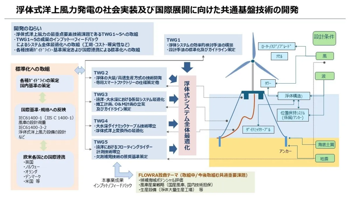 このプロジェクトでは、浮体式洋上風力の「共通基盤開発」に関する1件の研究テーマが採択されました。NEDOは国内の企業を中心に協力体制を築き、国際基準の策定を視野に入れた取り組みを進めます。この基盤開発は、浮体システムの規格化、大量生産、さらには排他的経済水域(EEZ)への展開を目指す技術ガイドラインの整備を含みます。