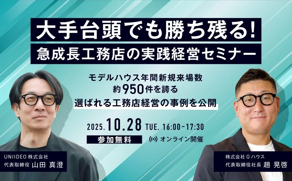 住宅業界の厳しい現実を打破し、急成長を遂げた工務店がある。それが株式会社Gハウスだ。この度、GハウスはUNIIDEO株式会社と共催でオンラインセミナーを開催する。このセミナーでは、売上がわずか5年間で2億円から43億円にまで成長したノウハウが公開される。この機会に、住宅業界で勝ち残るための実践的な経営戦略を学ぶことができる。