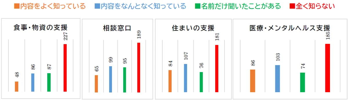 さらに深刻なのは、炊き出しやフードパントリー、医療支援などの支援サービスについて、なんと49%の人が「全く知らない」と回答しています。相談窓口などの情報も4割以上が知らない状態です。このように支援の存在が知られていないことで、必要なサポートが受けられないという現実が明らかになりました。