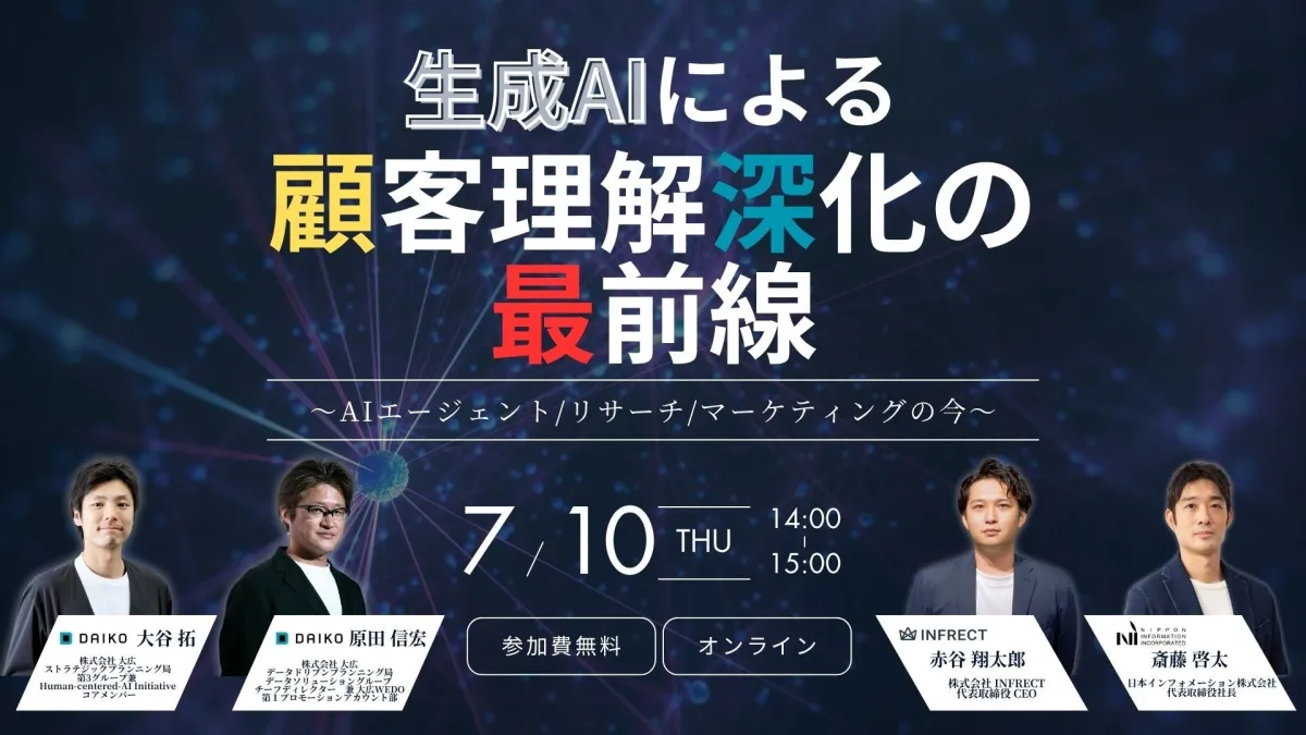 2025年7月10日、デジタル革命が進む現代において重要なテーマが扱われるオンラインセミナーが開催されます。このイベントは日本インフォメーション株式会社が主催し、様々な業界で活躍する専門家たちが登壇し、生成AIを利用して顧客理解を深める方法について語ります。セミナーには、株式会社大広からデータドリブンプランニング局の原田信宏氏とストラテジックプランニング局の大谷拓氏が参加し、それぞれの視点から新たなマーケティング戦略を展開します。