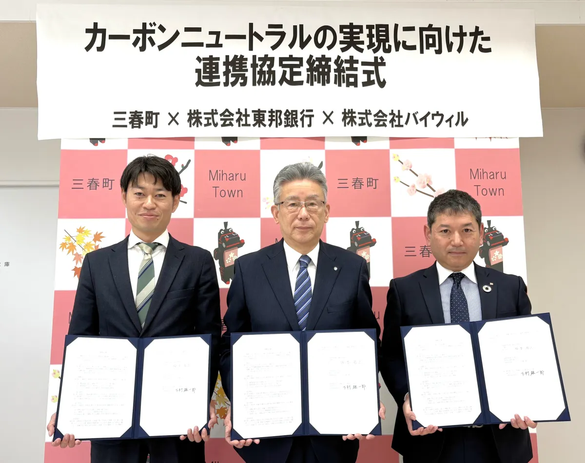 2025年5月20日、三春町役場で行われた締結式には、三春町長の坂本浩之氏、バイウィルの執行役員である齋藤雅英氏、東邦銀行の法人コンサルティング部部長本田拓野氏が出席しました。本協定の合意内容は、地域のカーボンニュートラルおよびサーキュラーエコノミーの実現に寄与するために、情報やサービス、ノウハウの提供を通じ、新たなビジネスモデルの創出に協力するというものです。