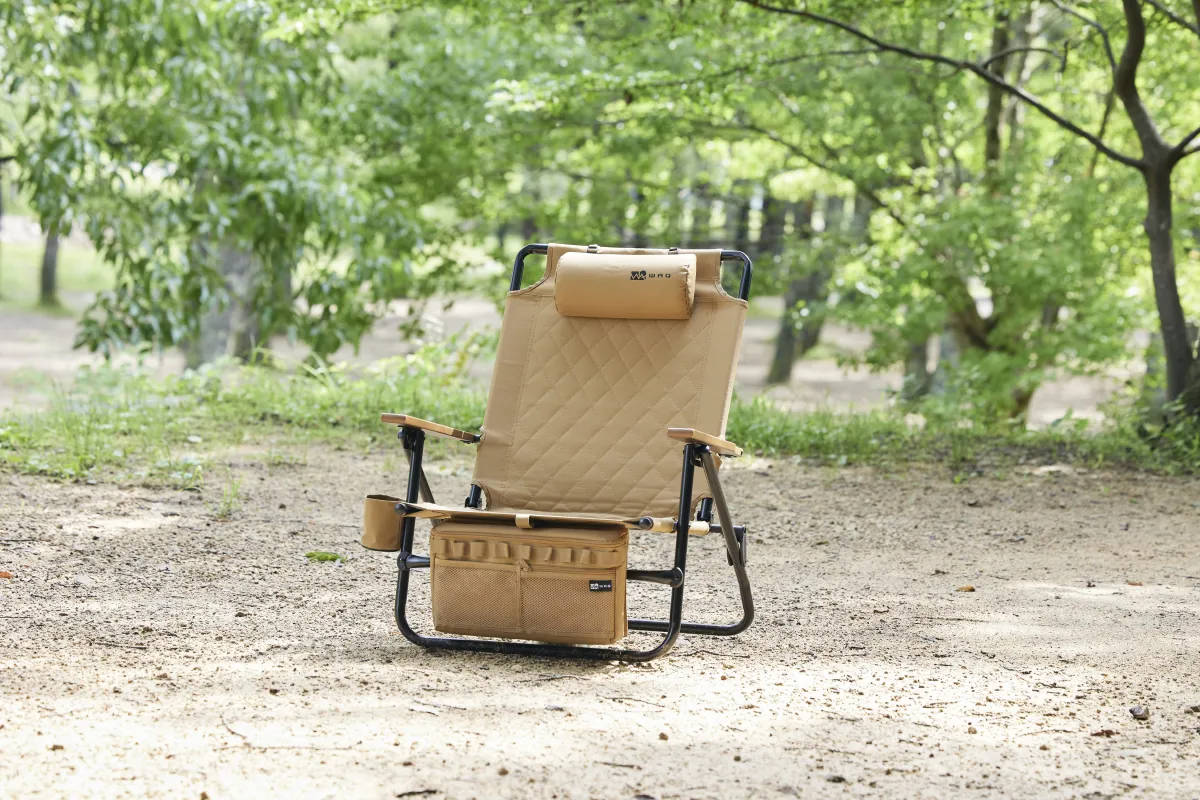 このチェアは、標準装備としてストレージバッグを備えており、散らかりがちな小物を手元に整理することができる便利なデザインです。また、断熱ウレタンを内蔵しており、簡易クーラーバッグとしても活用することができるため、ビールやジュースを冷やしておくのにも役立ちます。