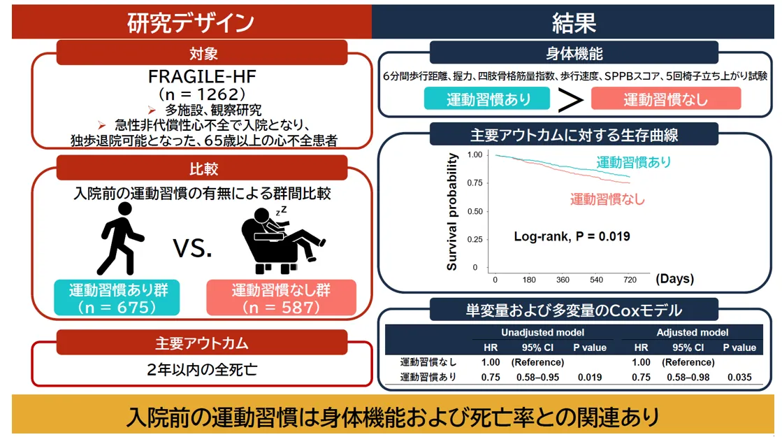 本研究では、世界最大規模の多施設レジストリデータ「FRAGILE-HF」を用いて、高齢心不全患者1,262名のデータを解析しました。具体的には、入院前の運動習慣の有無と退院後の予後を明らかにすることが目的です。