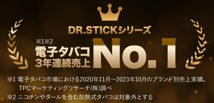DR.STICK(ドクタースティック)シリーズは、電子タバコの分野で圧倒的な人気を博し、【電子タバコ売上3年連続No.1】を達成しました。累計販売数が1800万個を超え、ますます多くのユーザーから支持を受けています。これもひとえに皆様のご愛顧あってのことです。心より感謝申し上げます。