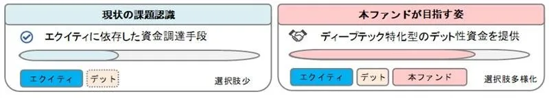 しかし、エクイティファイナンスによる資金調達は、スタートアップの成長を妨げる懸念があります。授権過多が起こると、創業者や従業員のインセンティブが損なわれ、経営の自由度にも影響を与える可能性があります。このため、デットファイナンスの重要性が高まっています。本ファンドは、こうした社会的要請に応じて、新たな金融エコシステムの構築を目指しています。