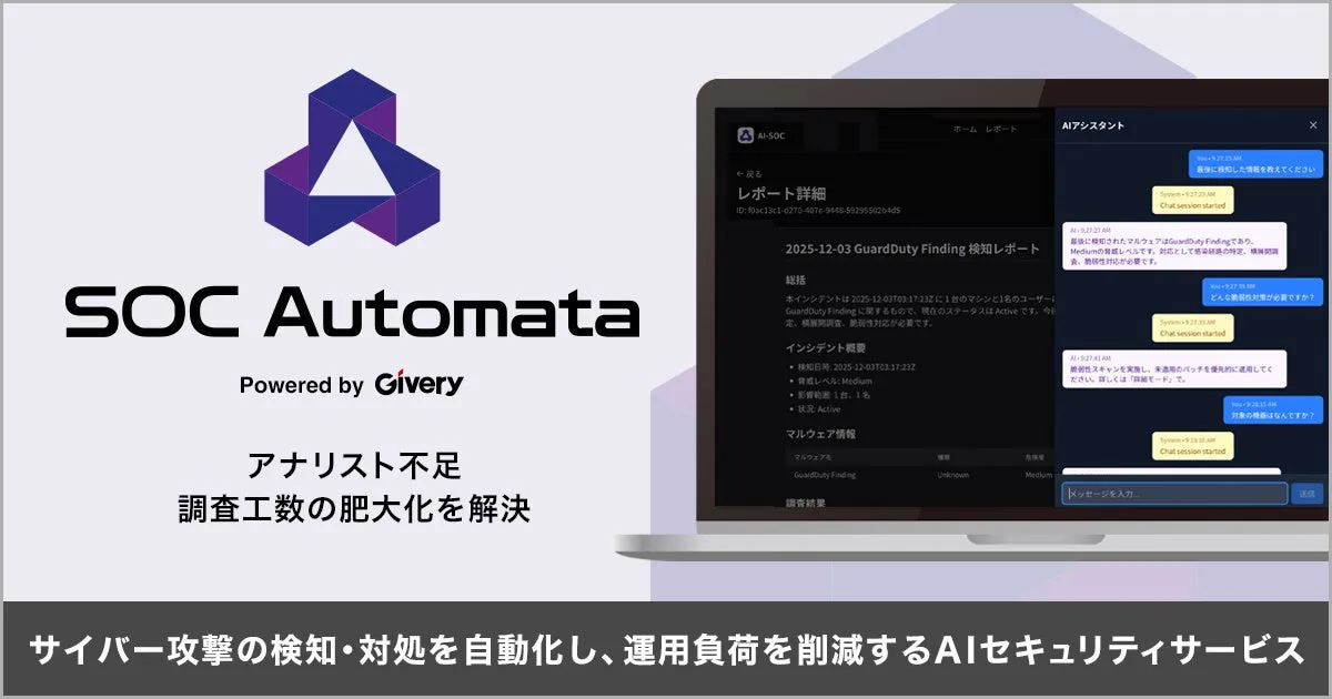 株式会社ギブリーは、SOC(Security Operation Center:セキュリティオペレーションセンター)の業務を効率化するためのAIセキュリティサービス「SOC オートマタ」のβ版を発表しました。このサービスは、急増するサイバー攻撃への対応と、アナリスト不足を解消することを目指しています。