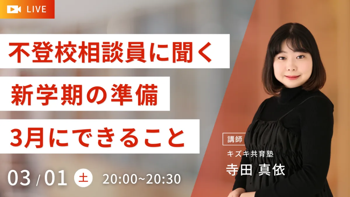 2025年3月1日、ウェブメディア「不登校オンライン」を運営する株式会社キズキが、無料オンラインイベントを開催します。このイベントは、不登校からの進級や進学に悩む保護者を対象にしており、先輩不登校経験者である寺田真依さんが登壇します。寺田さんは、キズキ共育塾の専任相談員として、多くの不登校家庭の相談に乗る立場にあります。