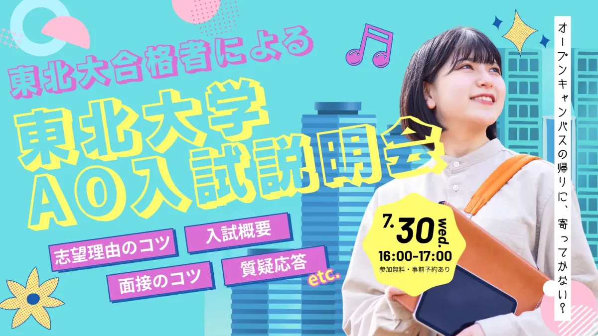 進路選びが本格化するこれからの季節、大学入試に向けた準備が不可欠です。特に東北大学のAO入試(総合型選抜)は、多くの高校生が興味を持つ人気の選択肢となっています。そのため、AO入試合格者を招いた無料説明会を7月30日に実施します。この機会を逃さず、成功への一歩を踏み出しましょう!
