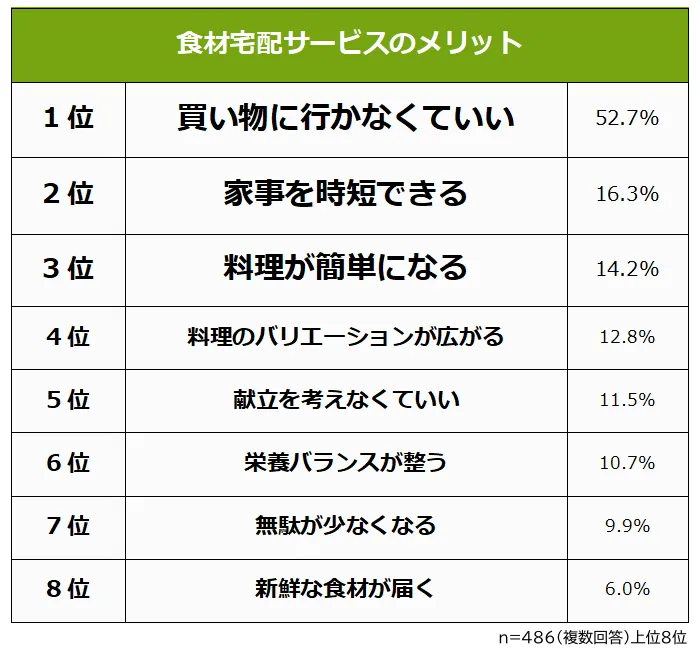 調査結果によると、食材宅配サービスのメリットとして最も多く挙げられたのは「買い物に行かなくていい」(52.7%)でした。その次に「家事を時短できる」(16.3%)、さらに「料理が簡単になる」(14.2%)と続きます。これらの結果から、忙しい日常においてどのようにサービスが便利さを提供しているのかが分かります。