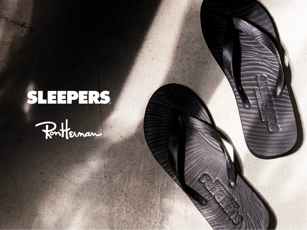 今回のサンダルは、太めのストラップを採用したレギュラーモデルに、通常レディースモデルでしか見られない厚みのあるソールを組み合わせた仕様です。使用されているのは高品質な天然ゴムで、これにより快適な履き心地が実現されています。また、ソール上部には「SLEEPERS」と「Ron Herman」のダブルネーム刻印が施されており、さりげなく特別感を演出しています。
