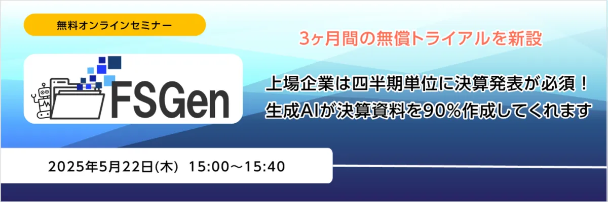 株式会社ニーズウェルが、決算資料自動生成ソリューション「FSGen」の無料オンラインセミナーを開催します。このセミナーでは、決算業務を効率化する手段として、生成AIの活用方法を詳しく解説します。開催日は2025年5月22日(木)15:00からです。
