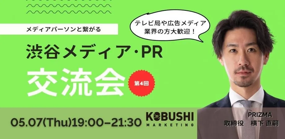 2026年5月7日(木)19:00、渋谷にてPR・メディア関係者のためのカジュアルな交流会が開催されます。このイベントは、KOBUSHI MARKETING合同会社が運営する渋谷道玄坂の『KOBUSHI BEER LOUNGE & BAR』で行われ、メディアやPR領域に関わるビジネスパーソンが集まります。