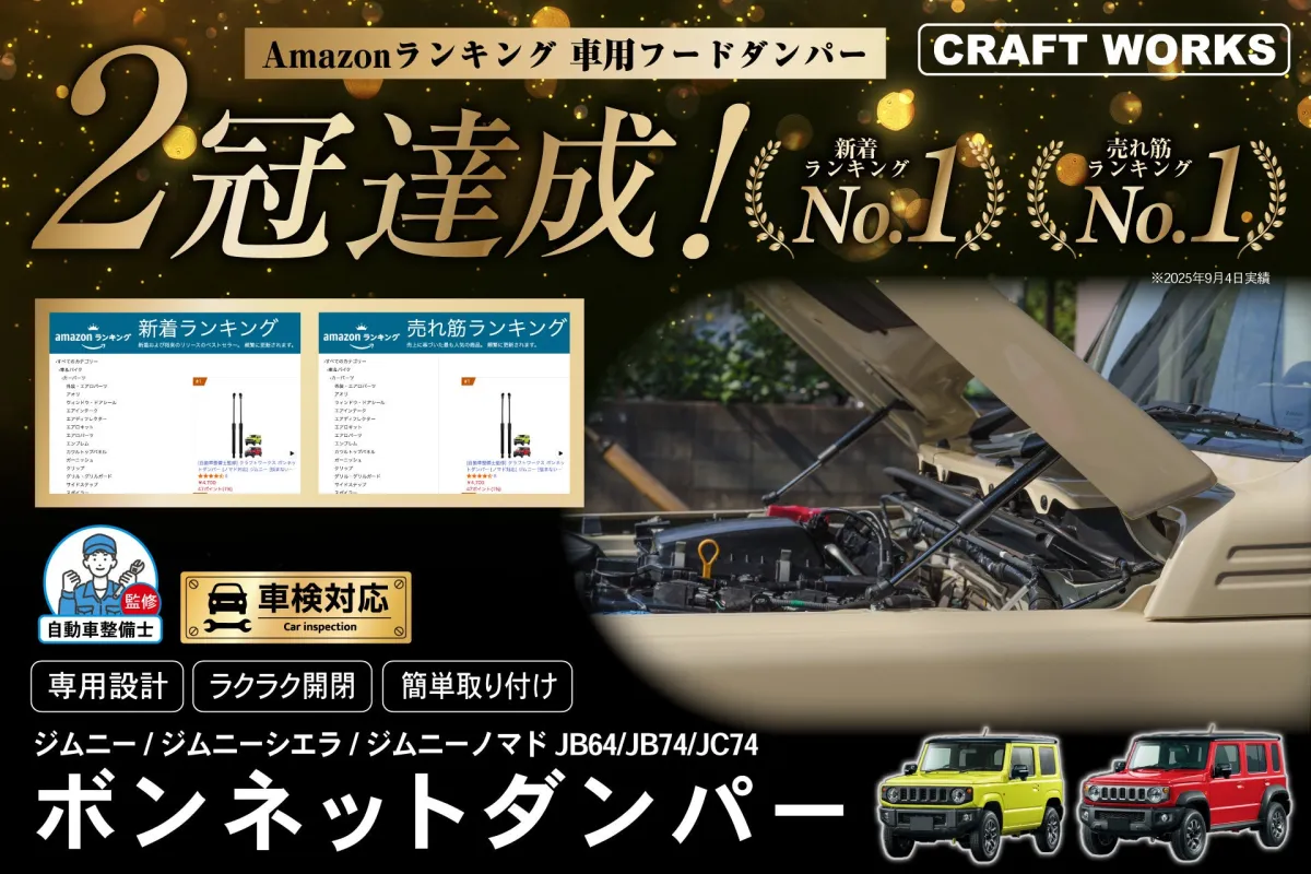 自動車アクセサリーブランドCRAFTWORKSが発売した「ボンネットダンパー」が、なんとAmazonの車用フードダンパー部門でベストセラーの栄冠を獲得しました!これは2025年9月4日のデータにもとづく成果で、特に新型ジムニーノマド(5ドア)に対応したサポートアイテムとして注目されています。