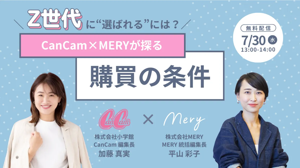 2025年7月30日、水曜日、オンラインで開催されるウェビナー「Z世代に"選ばれる"には?CanCam×MERYが探る『購買の条件』」についてご紹介します。このウェビナーは、株式会社MERYが株式会社小学館との共催で行い、主に若年層向けブランドのマーケティング担当者に向けた内容となっています。