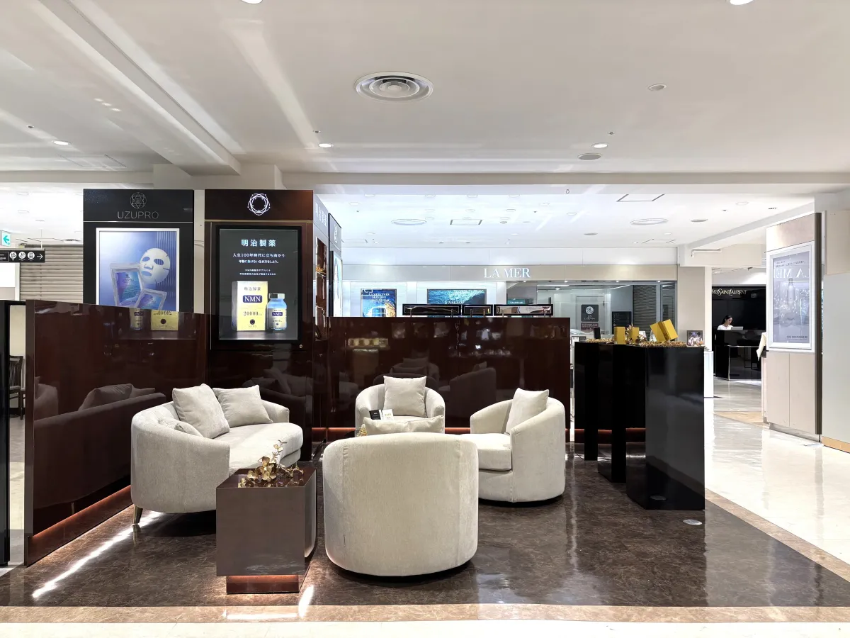 新しいラウンジは、心斎橋という多くの人々が訪れるエリアに立地しており、明治製薬のブランド理念や品質へのこだわりをより深く伝えることを目的に開発されました。百貨店内に隣接する一方で、静かで落ち着いた雰囲気を兼ね備えたこの空間は、訪れる人々にゆったりとした時間を提供します。