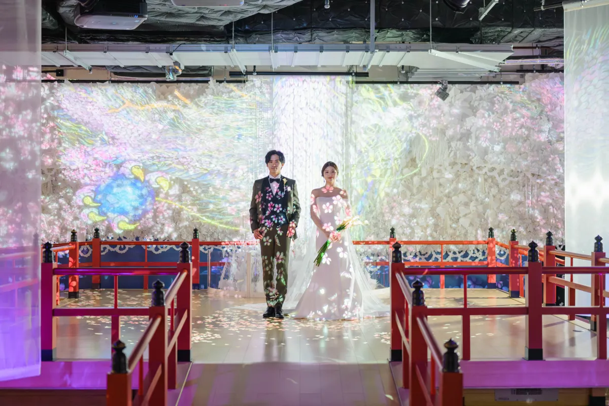 アトアの結婚式は、館内の3階に位置する「MIYABI」というスペースで行われます。和の情緒溢れる雰囲気と、光の切り絵による演出が融合したこの場所は、ただの結婚式ではなく、アート体験でもあります。新郎新婦はもちろん、ゲストも非日常の世界に身を委ねながら、特別な時間を楽しむことができるでしょう。