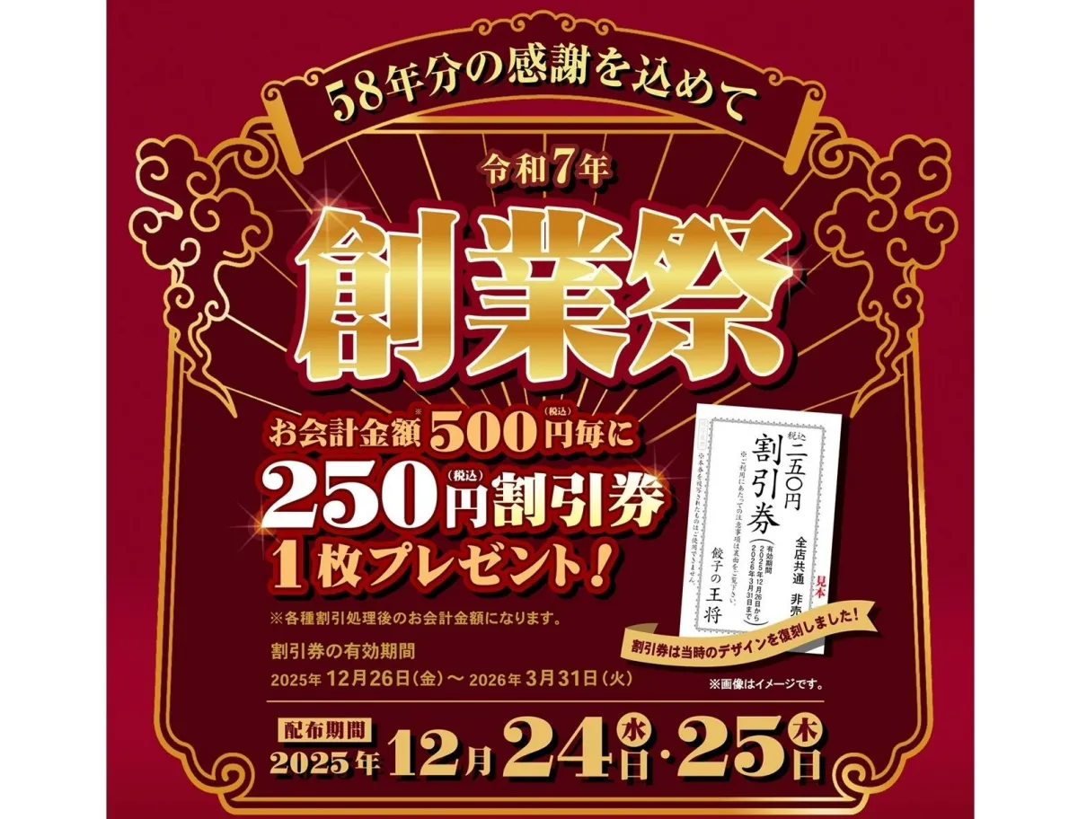「餃子の王将」では、創業58年分の感謝の気持ちを込めて、12月24日と25日の2日間にわたり「創業祭」を実施します。この期間中、会計金額税込500円ごとに「税込250円割引券」を1枚プレゼント。割引券は創業当時の餃子試食券を復刻デザインしたもので、懐かしさも感じさせる品です。