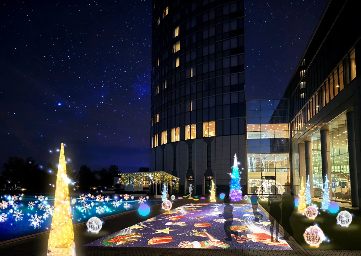 このイルミネーションでは、来場者の声や動きに応じて光が変化する、インタラクティブなコンテンツが新たに追加されます。具体的には、ホテルガーデンエリアやプールサイドに設置された「ボイスイルミネーション」では、訪れる人々の声に応じて光が踊り、来場するたびに新しい発見があります。また、「フロアインタラクティブ」では足元の映像が踏むたびに変わるため、大人から子どもまで、楽しめる仕掛けが満載です。
