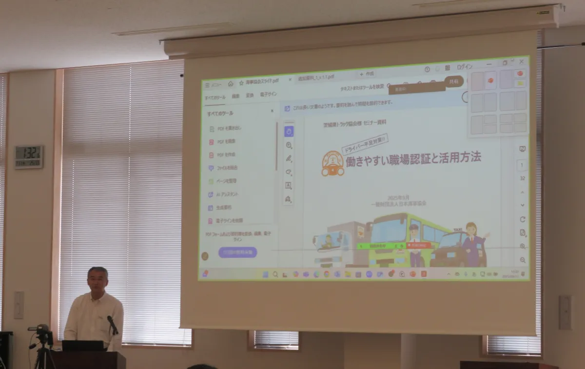 2025年9月11日に茨城県トラック協会主催で開催された「働きやすい職場認証」取得セミナー。ここでは、藤田チーフプロモーターをはじめとする専門家が登壇し、この制度の背景や目的について紹介しました。