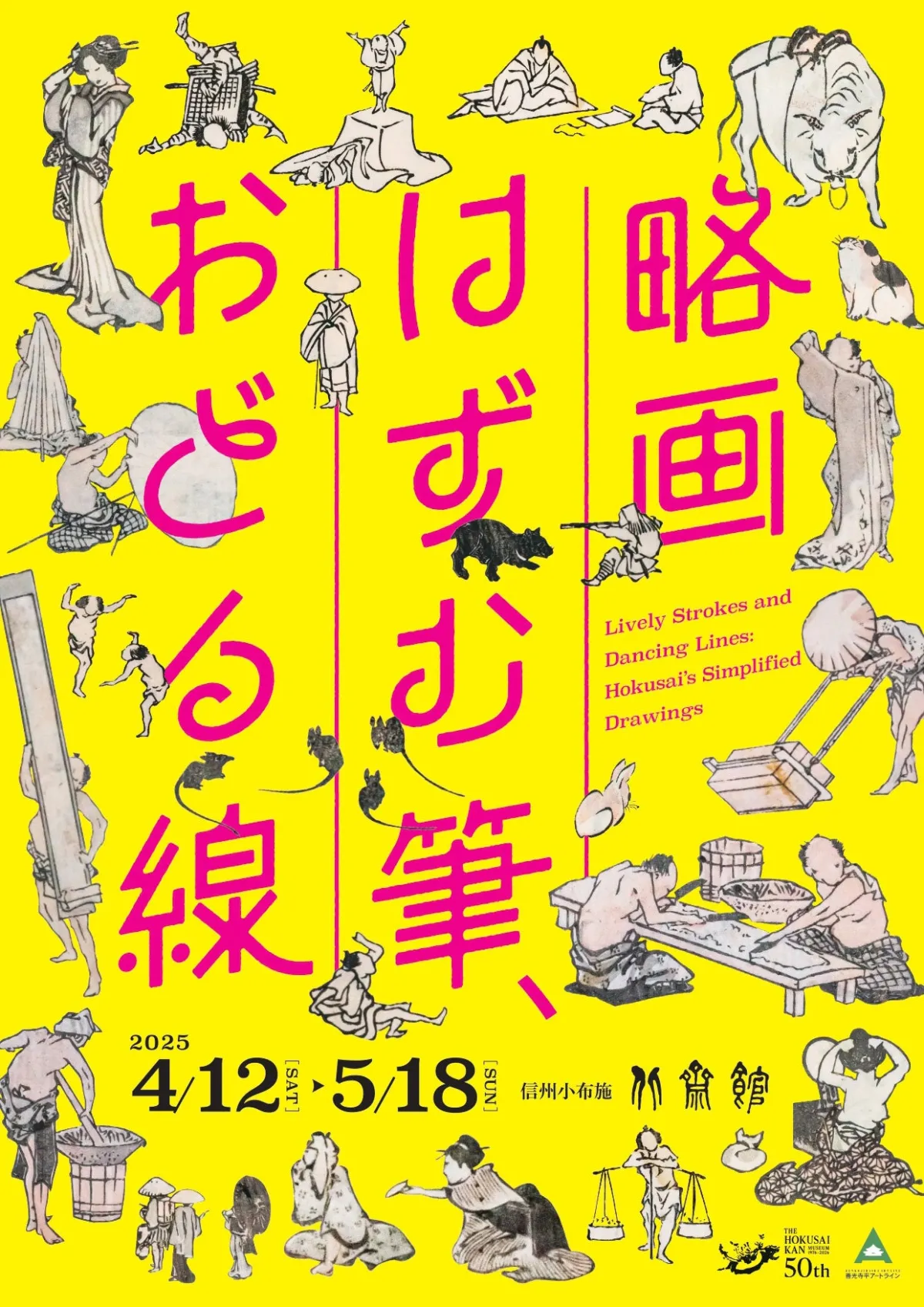 2025年4月12日から5月18日まで、北斎館にて展覧会「略画 ―はずむ筆、おどる線―」が開催されます。この企画展では、葛飾北斎が描いた魅力的な略画の数々が紹介されることになっています。北斎の画業は70年以上にも及び、その中でも特に50歳代以降に力を入れたのが「絵手本」です。彼の制作した多くの絵手本の中でも特に人気があるのが『北斎漫画』です。この作品は、絵を学ぶ人々にとっての貴重な手本となり、時代を超えて親しまれています。