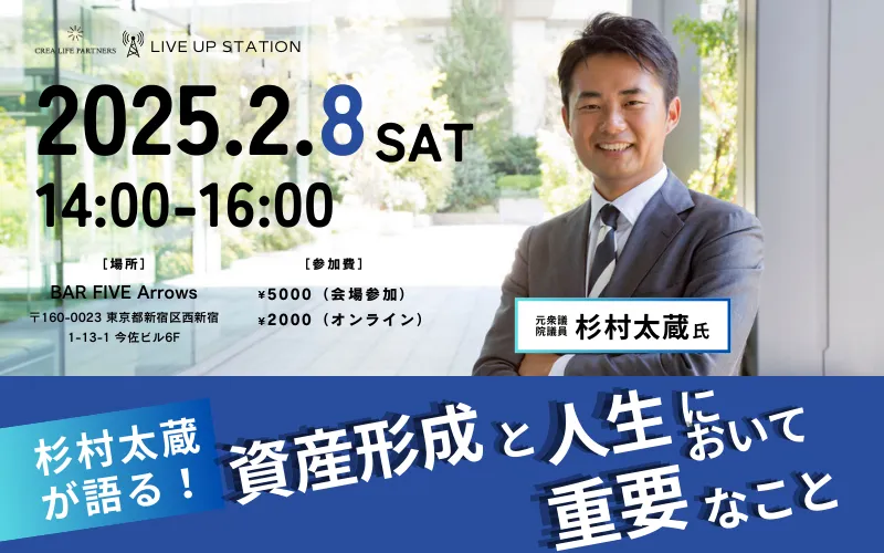世の中の流れが目まぐるしく変わる中、自分の資産をどう形成するかは、多くの人々にとって関心の重要なポイントです。そこで、特別セミナー「資産形成と人生において重要なこと」を2月8日(土)に開催します。講師には、元衆議院議員で現在はタレントや資産運用アドバイザーとして多方面で活躍する杉村太蔵氏を迎えます。