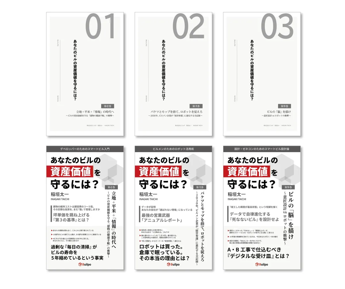 このシリーズは、ビルオーナーやビルメンテナンス会社、設計士、ゼネコン等、異なる立場に焦点を当てた実践的な内容で構成されています。「管理不全」を克服し、持続可能なビル管理に向けた具体的な手法を模索します。それぞれの巻は、業界が直面する課題を正面から捉え、データ駆動型のアプローチを通じてビルの資産価値を守る方法を提案します。