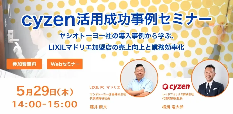 2025年5月29日、オンラインで開催される「cyzen活用成功事例セミナー」では、LIXILマドリエ加盟店や建築関連企業が注目する売上向上の秘訣を学ぶことができます。このセミナーは、レッドフォックス株式会社が提供する「cyzen」アプリの導入事例を基に、業務の効率化や売上増加に向けた具体的な施策について詳しく解説されます。