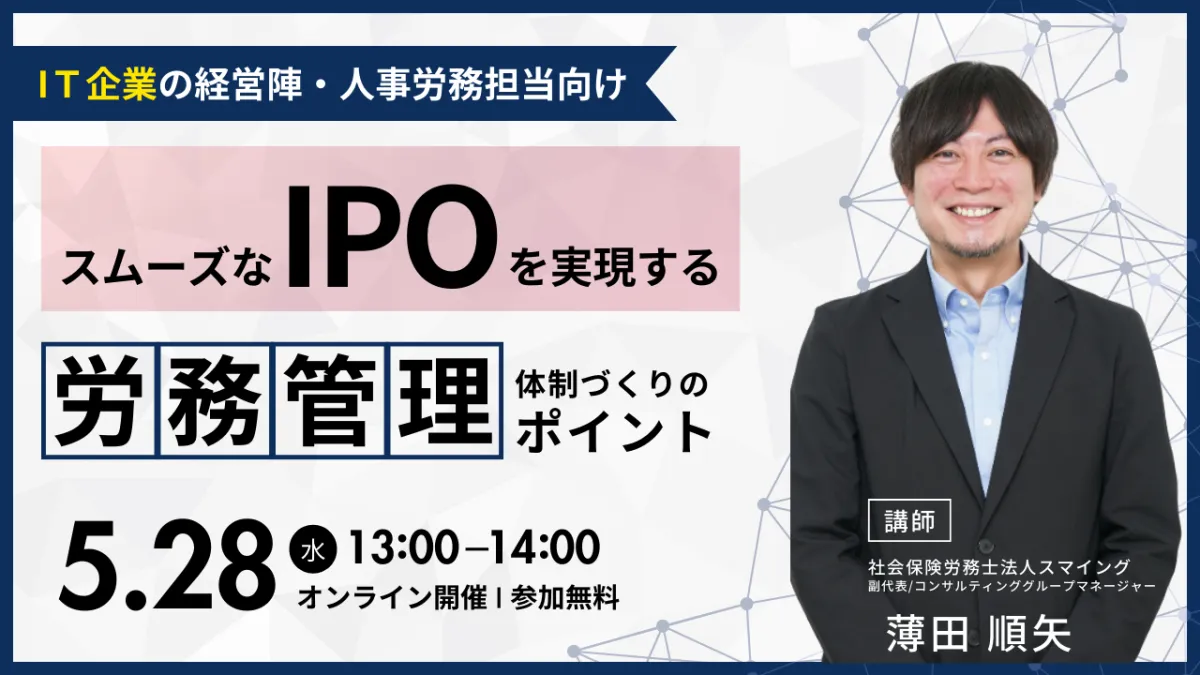 社会保険労務士法人スマイングが、2025年5月28日(水)に「スムーズなIPOを実現する、労務管理体制づくりのポイントセミナー」を開催します。このセミナーは、IT企業の人事労務の専門家としての知見を基に、IPO準備に不可欠な労務管理の重要性を受講者に伝えることを目的としています。