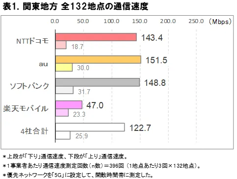 調査結果によると、132地点の下り通信速度では、auが151.5Mbpsでトップでした。続いてソフトバンクが148.8Mbps、NTTドコモが143.4Mbps、楽天モバイルは47.0Mbpsと続きました。全体の平均は122.7Mbpsで、関西地方(139.9Mbps)よりも遅い結果となりました。特に、都県ごとに見ると、東京都や茨城県ではNTTドコモがトップ、神奈川県と埼玉県ではauが優勢であり、千葉県はソフトバンクがトップでした。