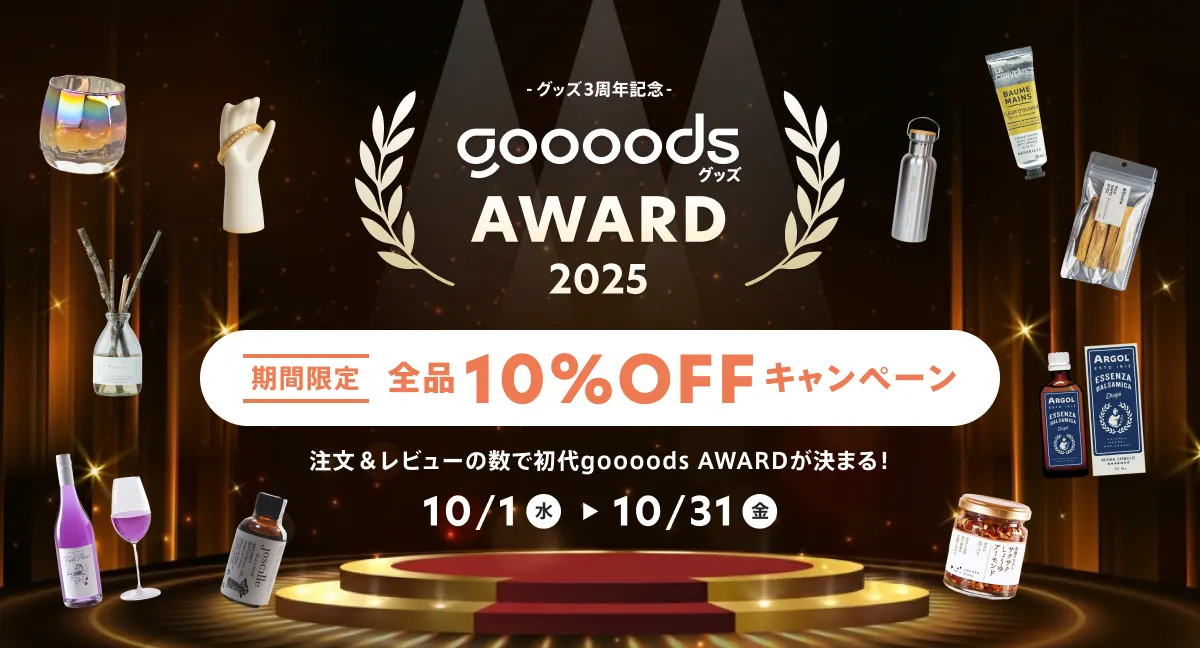 日本の新しい仕入れサイト「グッズ」を運営するgoooods株式会社が、2025年10月1日から10月31日までの期間限定で、全品10%OFFの「goooods AWARD 2025 キャンペーン」を開催します。このキャンペーンは、サービス開始から3年を迎え、多くのバイヤーやブランドに支えられてきた感謝の気持ちを込めたものです。